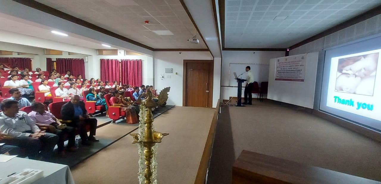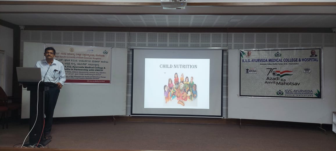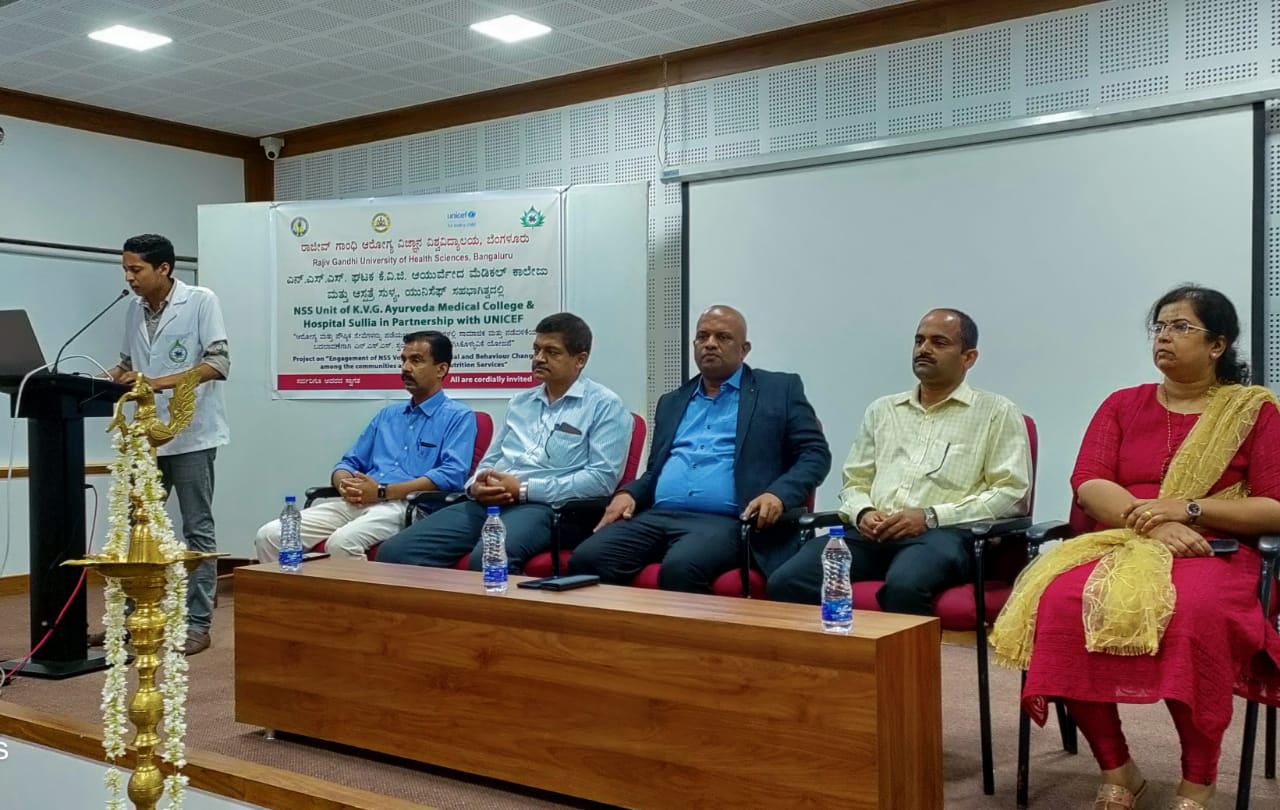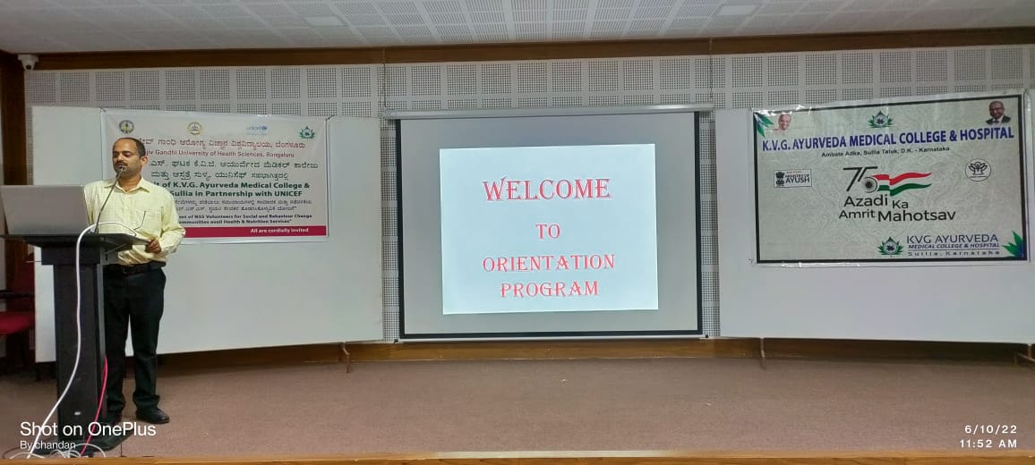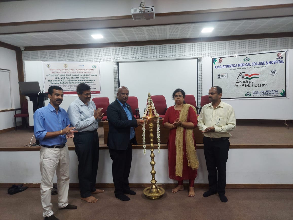 NSS unit of KVG Ayurveda Medical College & Hospital Sullia in partnership  with RGUHS, Bangalore and UNICEF organized an orientation program on the project “Engagement of NSS Voluntaries for Social and Behavior change among the communities avail Health and Nutrition Services.” On 10.06.2022 at KVG Ayurveda Medical College & Hospital Sullia premises. The program was inaugurated by Prof. Dr. Leeladhar D V, Principal, KVG Ayurveda Medical College & Hospital sullia. The guests were Dr. Ashok K, Prof. & HOD, Dept. of Prasoothi Tantra and Stree Roga, Dr. Purushothama K.G, Prof & HOD, Dept of Rasashastra and Bhaishajya Kalpana, CEO of KVG Ayurveda Pharma and Dr.Kavitha B M, Prof., Dept. of Dravyaguna, KVG Ayurveda Medical College & Hospital Sullia. Dr. Pramoda P. A. NSS Program Officer delivered a talk on “Immunization & Vaccination”. Prof. Dr. Ashok K spoke on “Nutrition”