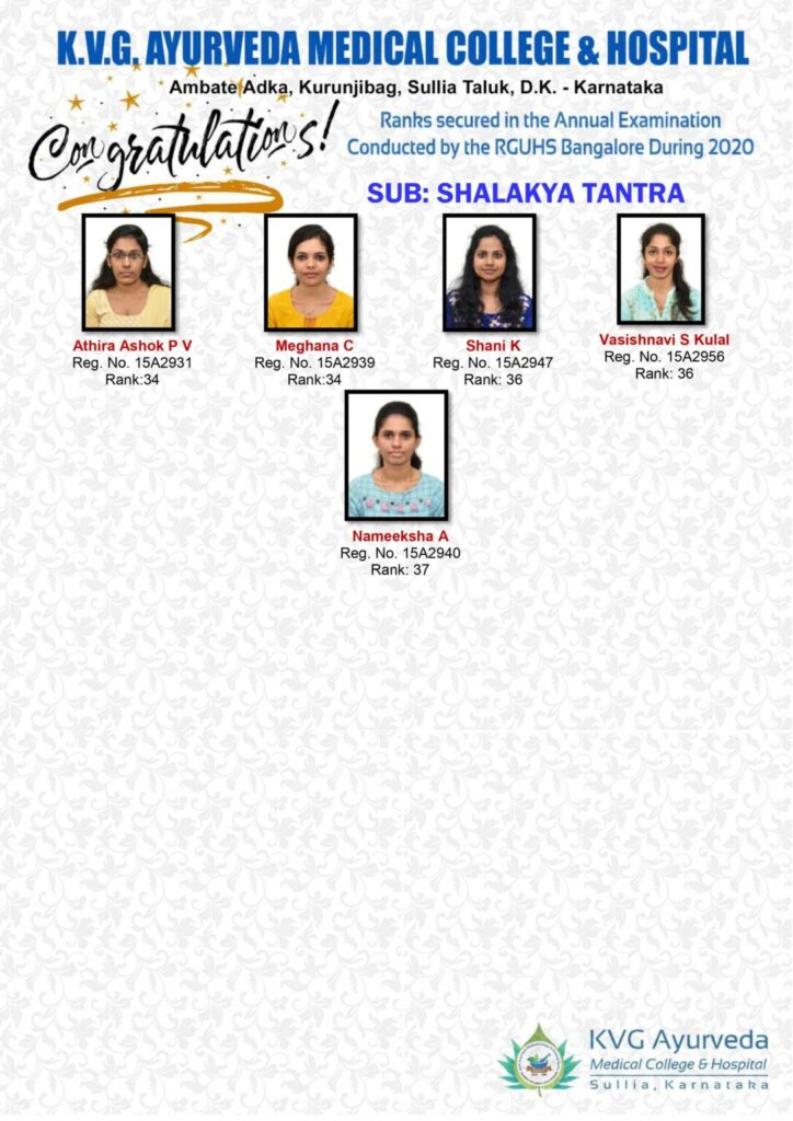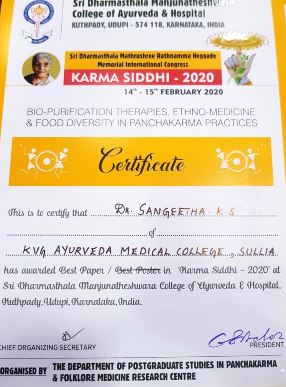 Presented and was awarded with Best Paper for the oral paper presentation at the “International Level Seminar” ‘Karma Siddhi 2020’ on Bio-Purification Therapies, Ethno-Medicine & Food Diversities in Panchakarma Practices – organized by SDM Ayurveda Medical College, Udupi, Karnataka.