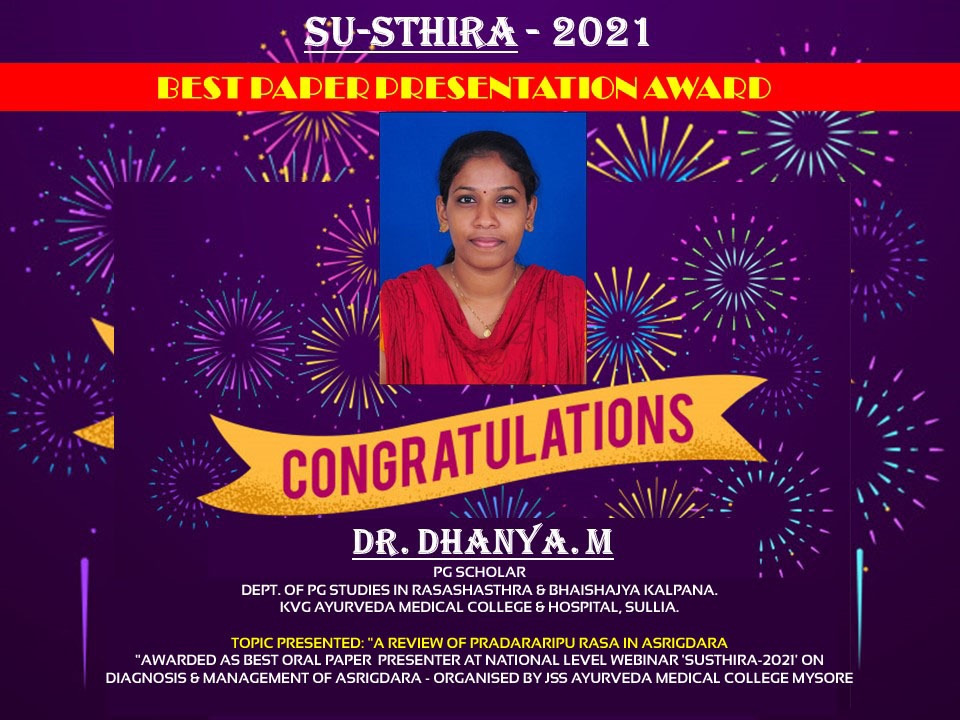 Awarded as Best Oral Paper Presenter at the National Level Webinar ‘Susthira-2021’ on Diagnosis & Management of Asrigdara – organized by JSS Ayurveda Medical College, Mysore.