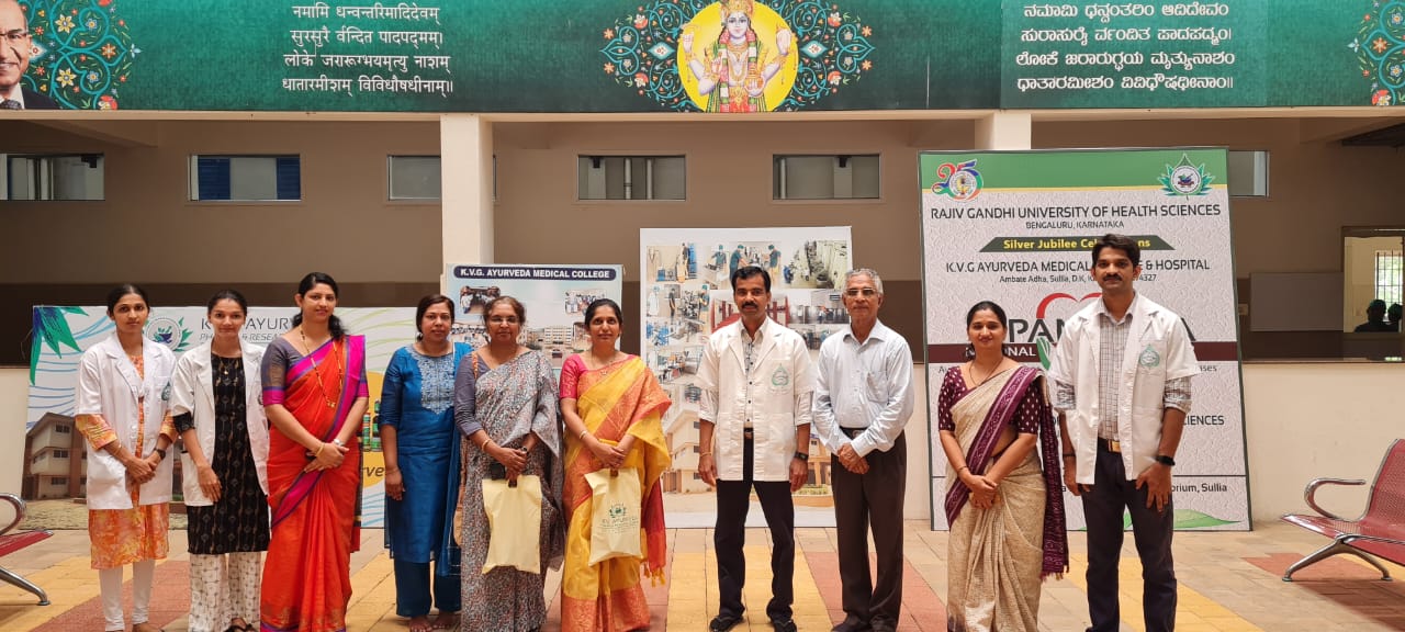 Members of Local Inspection committee; Rajiv Gandhi University of Health Sciences, Bangalore visited KVG Ayurveda Pharma and Research centre on 15/07/2022. They visited the Production and quality control sections of the pharma. CEO Dr Purushottham KG briefed about the functioning of pharmacy. They appreciated the hygiene, maintenance and production quality of the pharma and research centre. All teaching staff s, PG Scholars of Dept. of Rasashastra and Bhaishajya Kalpana assisted the visit.