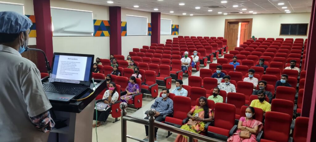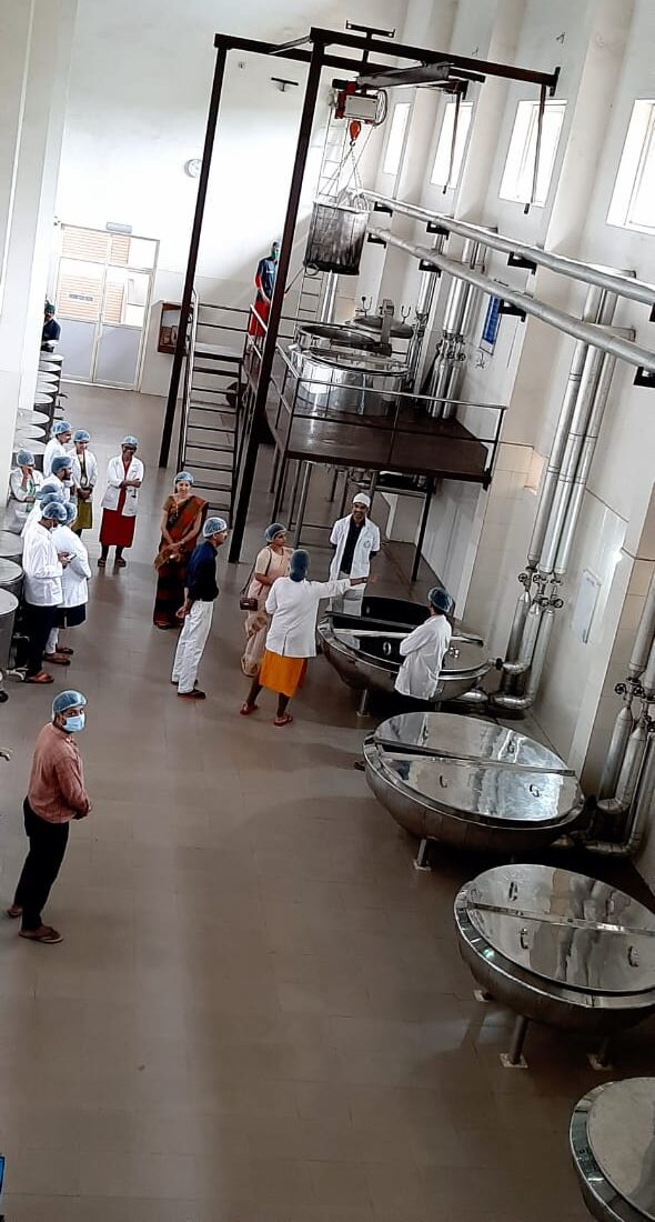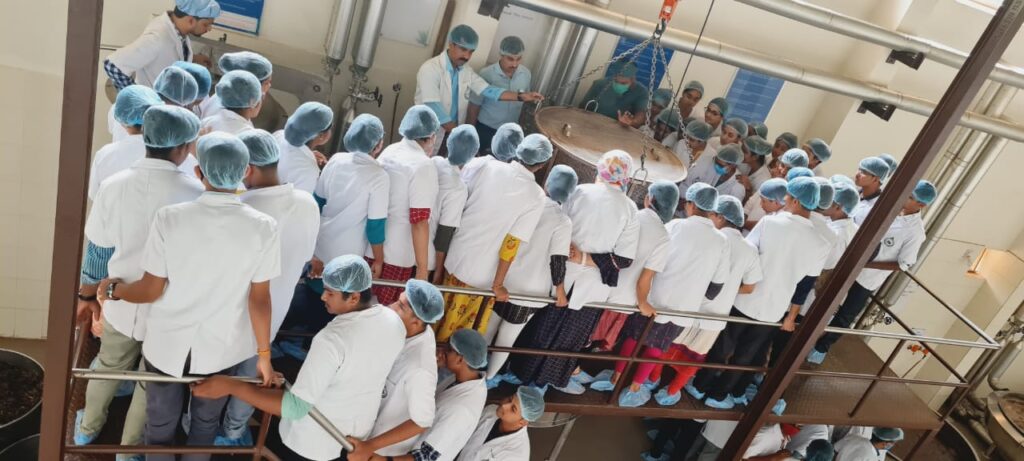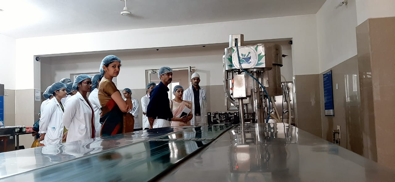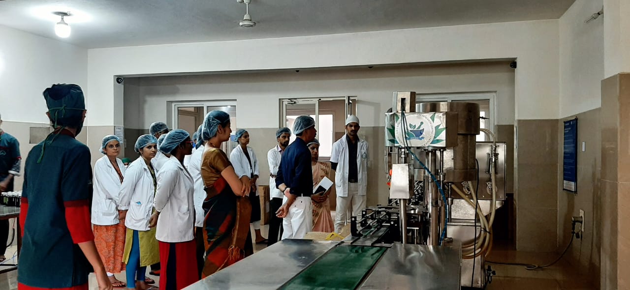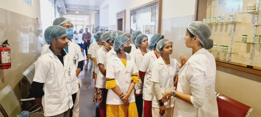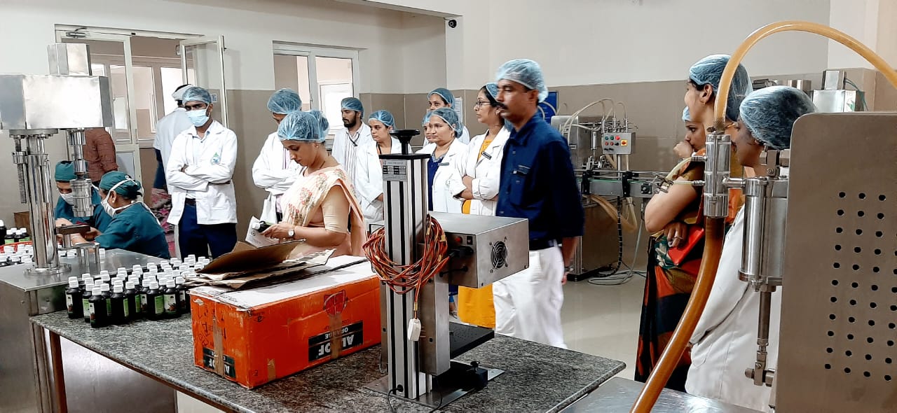 On 8/12/2021, 2nd-year B.A.M.S Students from Muniyal Institute of Ayurveda Medical Sciences, Manipal had visited our Pharmacy as a part of their academic curriculum. There were 80 students accompanied by their staff Dr. Dinesh Nayak, Dr. Vatsala Nayak and Dr. Bibin K.B. An introduction to the Establishment of our Pharmacy was given by Dr. Harshitha, Professor, Dept. of Rasashastra & Bhaishajya Kalpana. Later a brief note on the functioning of our Pharmacy, products manufactured in our unit and GMP guidelines were explained by the Production Manager Dr. Gopalkrishna Nayak. They were then divided into 2 groups and were taken to different sections of our production unit and were explained in detail about the ongoing production, working of different instruments, maintaining the standards and quality of our products and other details. Quality control lab head Dr. Pavana K.B, Asst.Professor, Dept. of Rasashastra & Bhaishajya Kalpana and Analytical chemists ( Rathan Kumar K.T, Shubhashree B.T )explained in detail the Quality control tests conducted, their needs and applications of various instruments. Very good feedback was given by their staff and students.